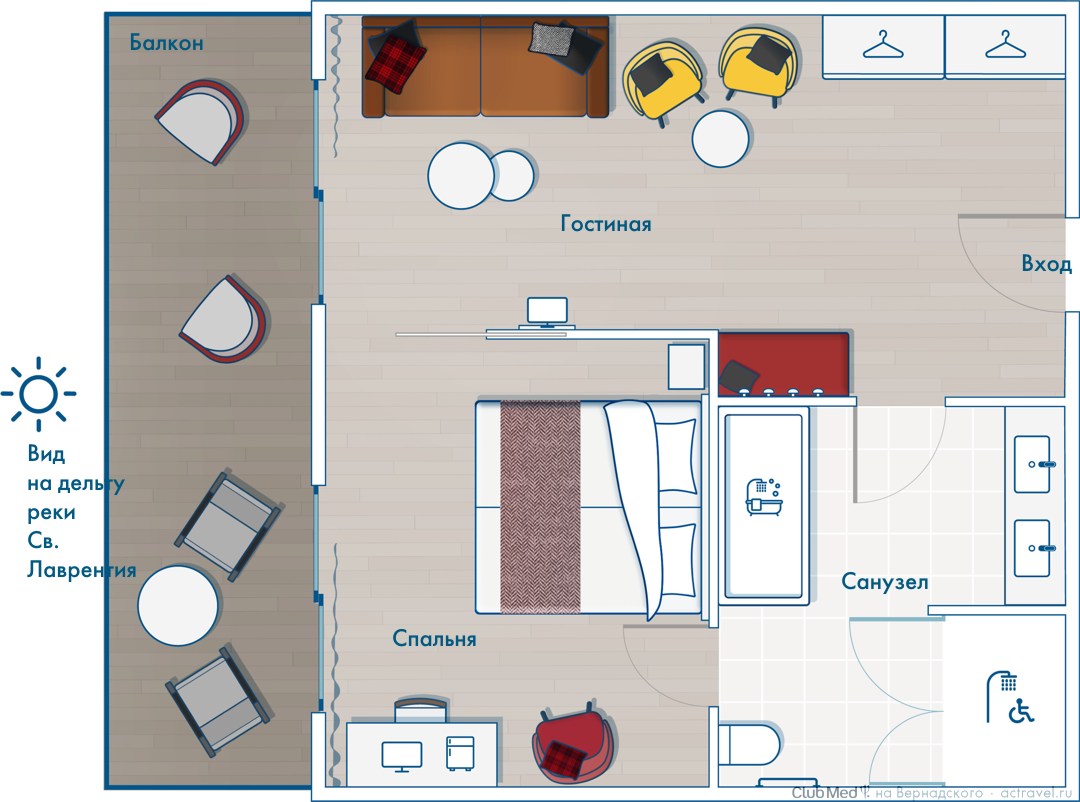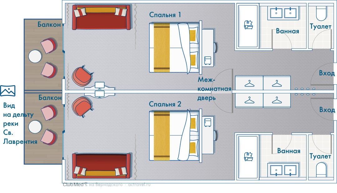 Со стороны родительской спальни с балкона открывается вид на легендарную реку Святого Лаврентия, на которую вы никогда не устанете смотреть. Родители могут пользоваться собственной ванной комнатой. На детской стороне большое пространство с двумя односпальными кроватями, большим раскладным креслом у камина и душевой комнатой. Основные цвета — красный и желтый — подчеркивают атмосферу старинного семейного дома с использованием теплых материалов и деревянной мебели.