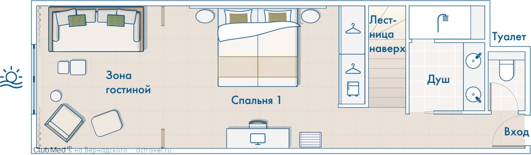 Двухуровневый номер с комнатами друг над другом. Отдельная спальня для детей. Расположен в центре курорта.