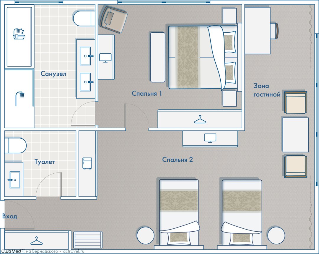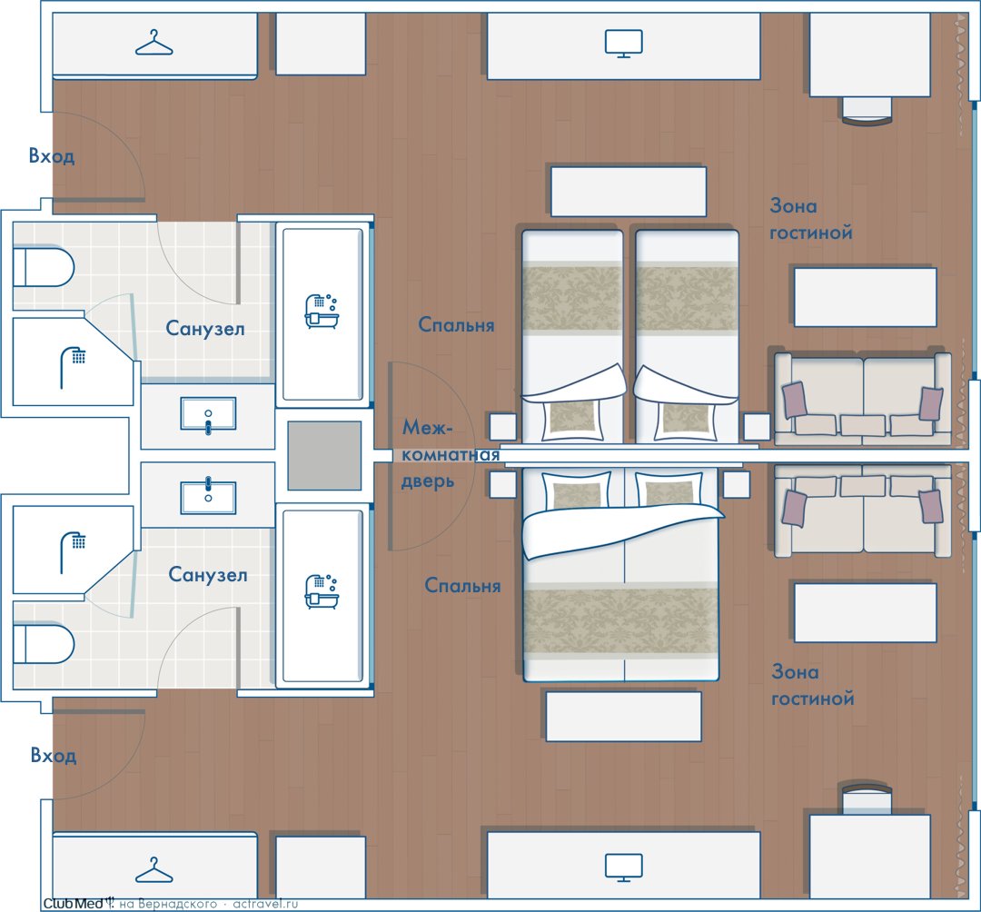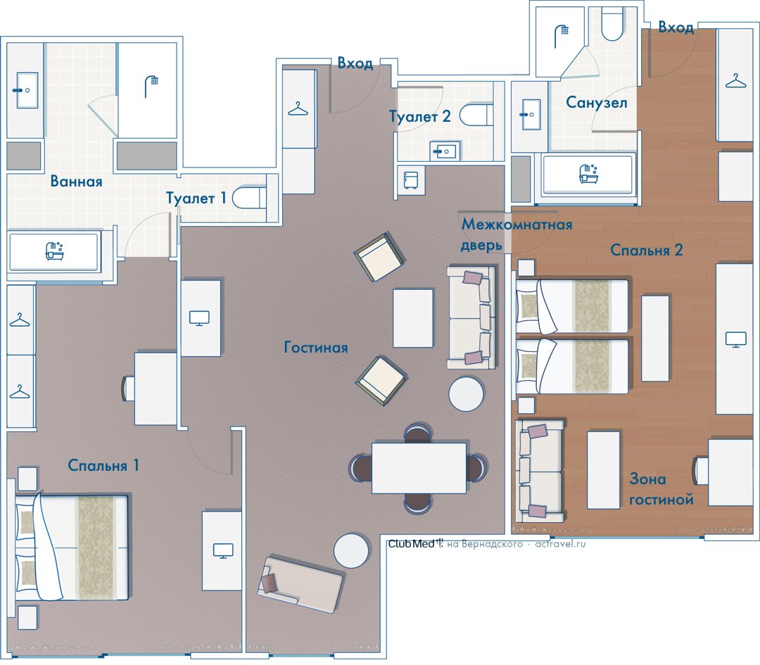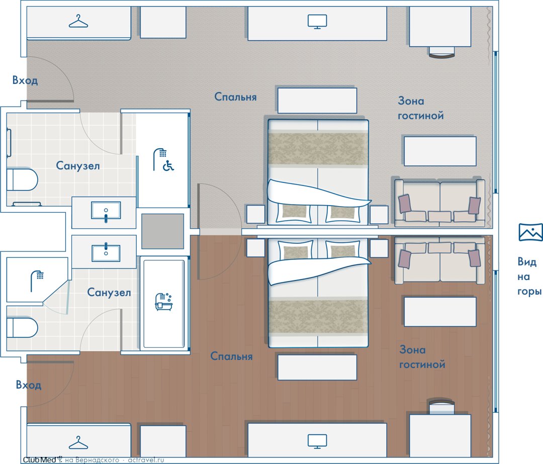 Два уютных номера с зоной гостиной в каждом и межкомнатной дверью.